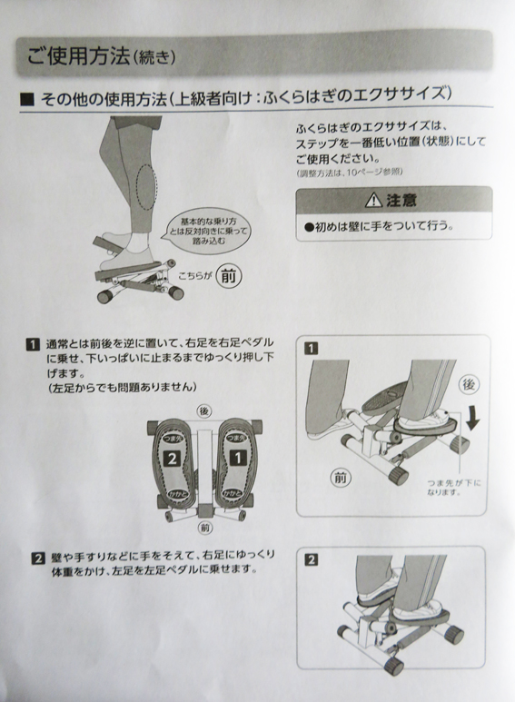 取り扱い説明書によると、ステッパー器具を使用してペダルの上に両足を乗せ足踏みをすると、足踏みの際に自転車のペダルをこぐのとは違って、油圧シリンダーによって足踏みに抵抗があるため足の膝から下の筋肉を鍛える効果があるようだ。説明書では、通常は前進方向の足踏みを行うが、足踏みの方向を逆にする「ふくらはぎ」のエクササイズも可能である。通常は1日に10分程度のエクササイズで良いのだが、それ以上にエクササイズを続けると油圧シリンダーが熱くなるので、長時間の使用は制限されている。