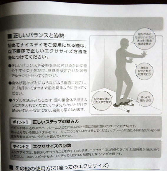 取り扱い説明書によると、ステッパー器具を使用してペダルの上に両足を乗せ足踏みをすると、足踏みの際に自転車のペダルをこぐのとは違って、油圧シリンダーによって足踏みに抵抗があるため足の膝から下の筋肉を鍛える効果があるようだ。説明書では、通常は前進方向の足踏みを行うが、足踏みの方向を逆にする「ふくらはぎ」のエクササイズも可能である。通常は1日に10分程度のエクササイズで良いのだが、それ以上にエクササイズを続けると油圧シリンダーが熱くなるので、長時間の使用は制限されている。